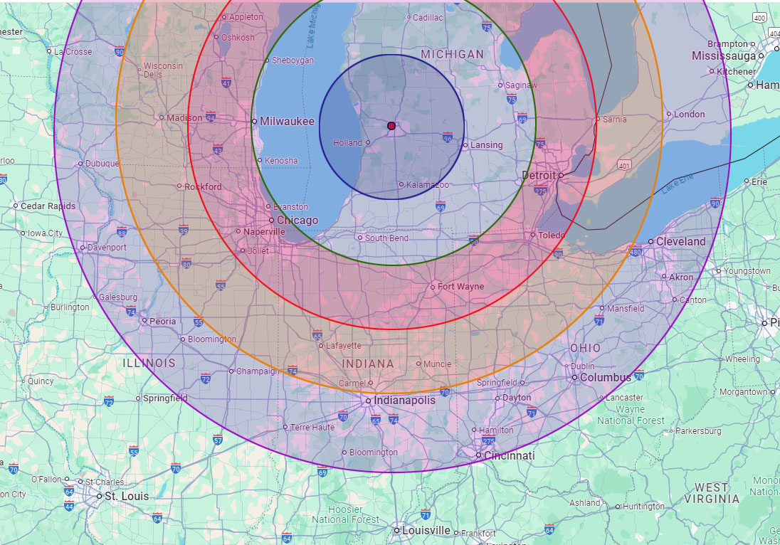 With two fully stocked warehouses located in Grand Rapids and Livonia, we offer a wide selection of HVAC ductwork ready for immediate dispatch. Our strategic locations allow us to provide delivery service to customers within 350 mile radius of both Grand Rapids and Livonia. Offering delivery within a 5-hour drive from Grand Rapids and Livonia means reaching a wide service area that includes major cities like Chicago, Indianapolis, Milwaukee, Louisville, Cleveland and beyond. This broad reach not only serves a diverse range of clients but also enables rapid, dependable delivery, minimizing project delays and ensuring that high-quality, custom-fabricated components are available quickly across the Midwest.